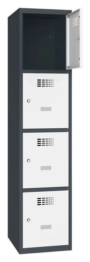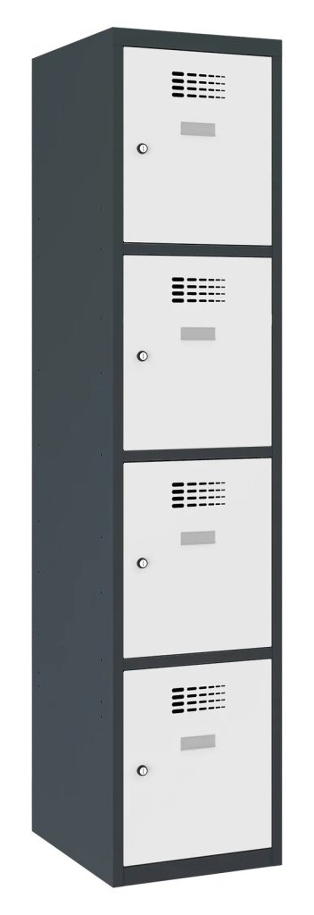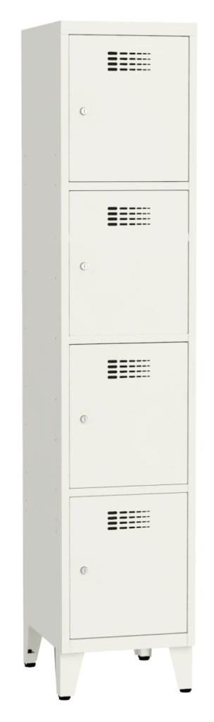 Štvordverová šatníková skrinka so zváranou konštrukciou a moderným dizajnom ventilačného systému. Výška 1800 x šírka 400 x hĺbka 500 mm. Na dverách samolepiaci štítok na meno. 16 farebných odtieňov na výber. Cylindrický zámok alebo uzáver pre visiaci zámok.Dvere 410x350mm