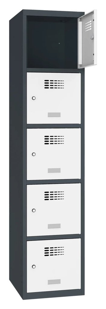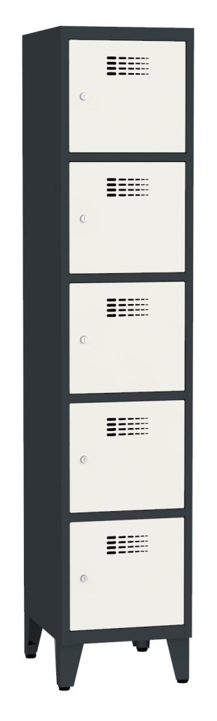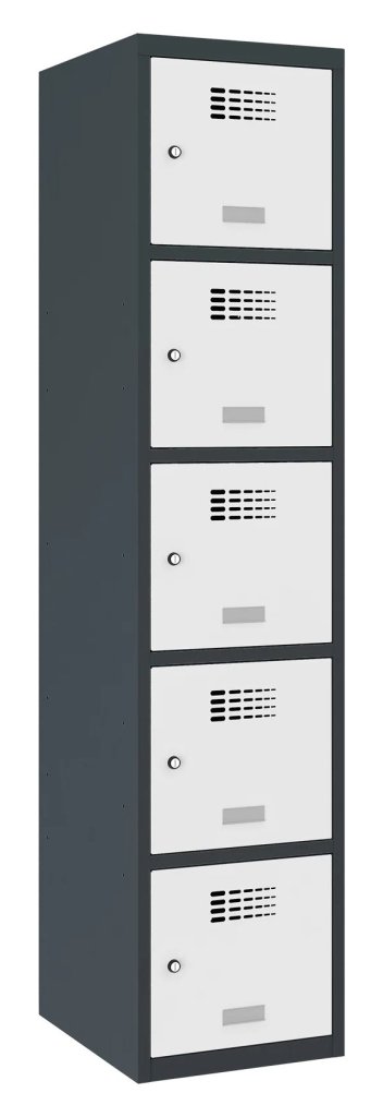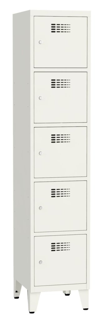 Päťdverová šatníková skrinka so zváranou konštrukciou a moderným dizajnom ventilačného systému. Výška 1800 x šírka 400 x hĺbka 500 mm. Na dverách samolepiaci štítok na meno. 16 farebných odtieňov na výber. Cylindrický zámok alebo uzáver pre visiaci zámok.