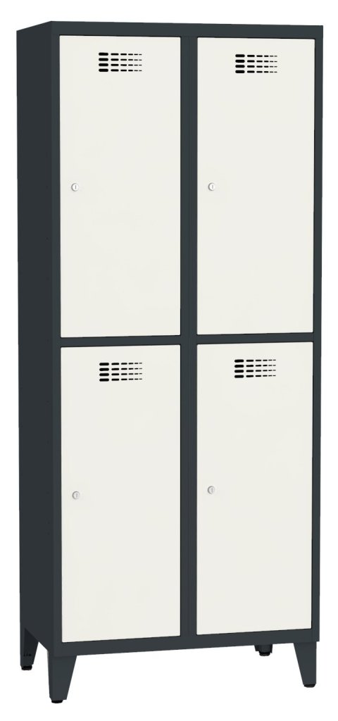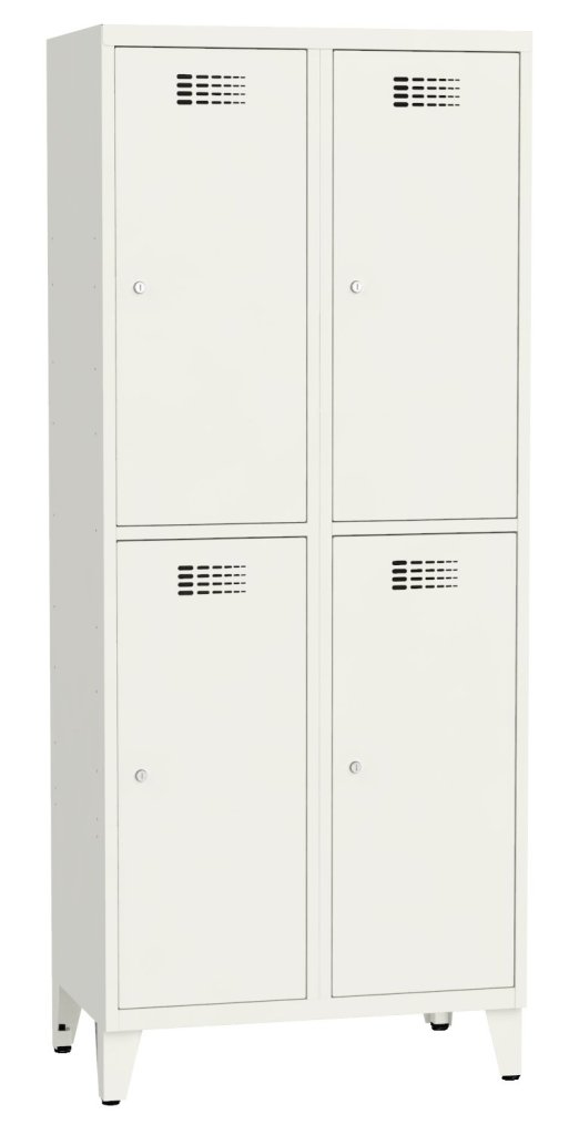 Štvordverová šatníková skrinka so zváranou konštrukciou a moderným dizajnom ventilačného systému. Ideálny do malých priestorov. Výška 1800 x šírka 800 x hĺbka 500 mm. Štandardné vybavenie skrinky: tyč s háčikmi, samolepiaci štítok na meno. 16 farebných odtieňov na výber. Cylindrický zámok alebo uzáver pre visiaci zámok.