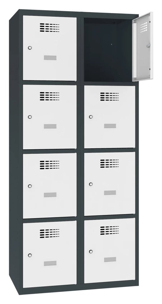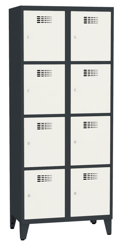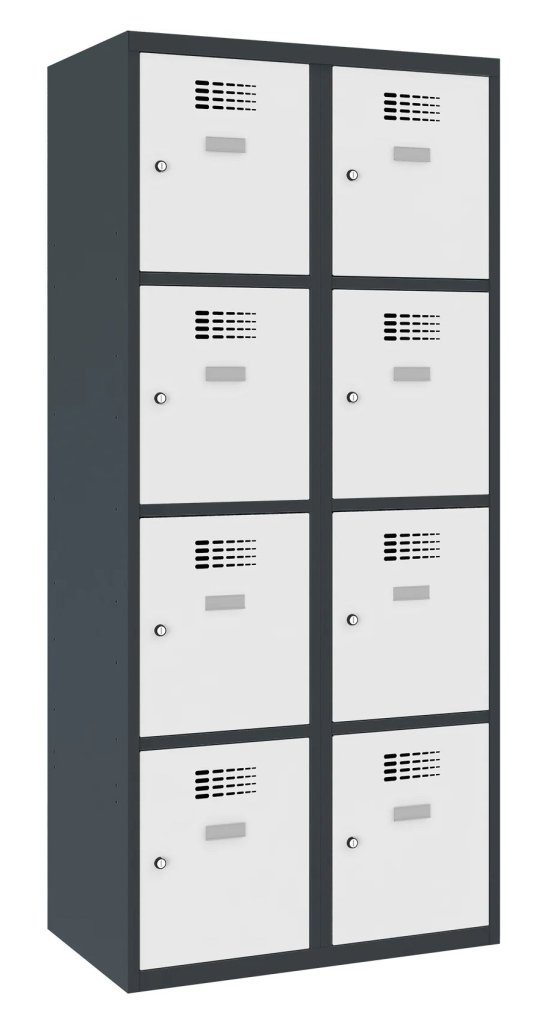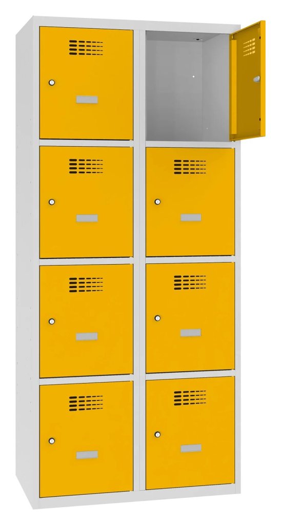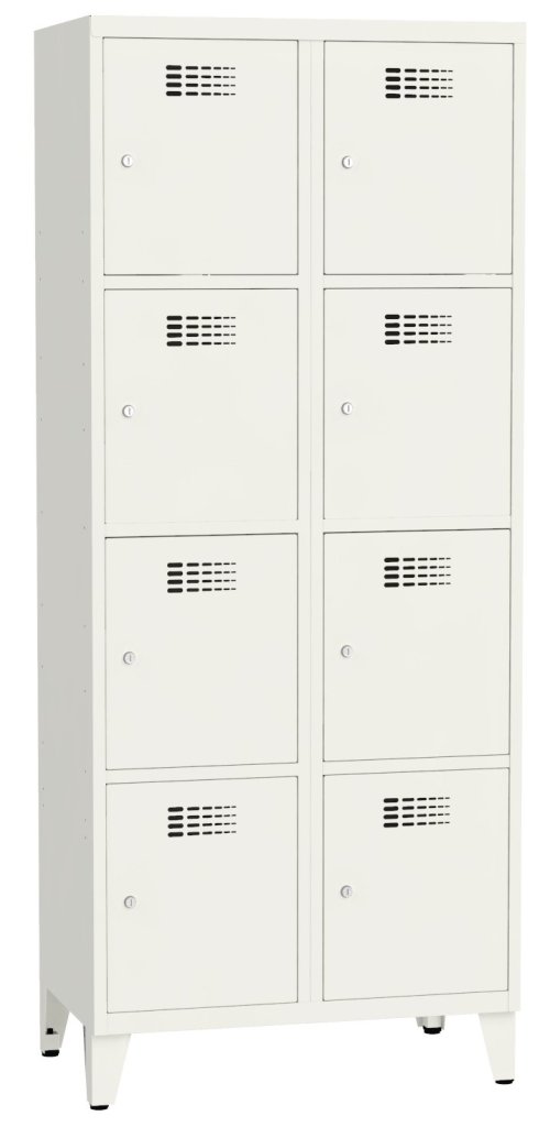 Osmidverová šatníková skrinka so zváranou konštrukciou a moderným dizajnom ventilačného systému. Výška 1800 x šírka 800 x hĺbka 500 mm. Na dverách samolepiaci štítok na meno. 16 farebných odtieňov na výber. Cylindrický zámok alebo uzáver pre visiaci zámok.Dvere V 410 mm Š 350 mm