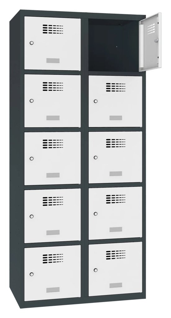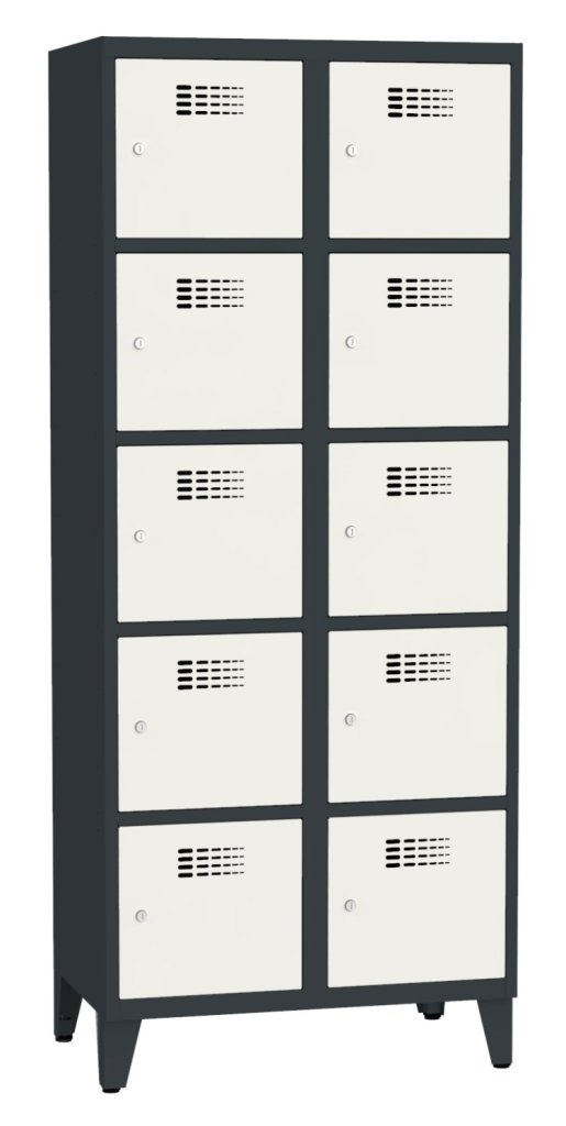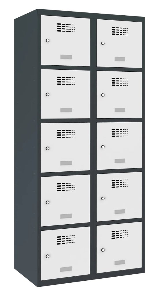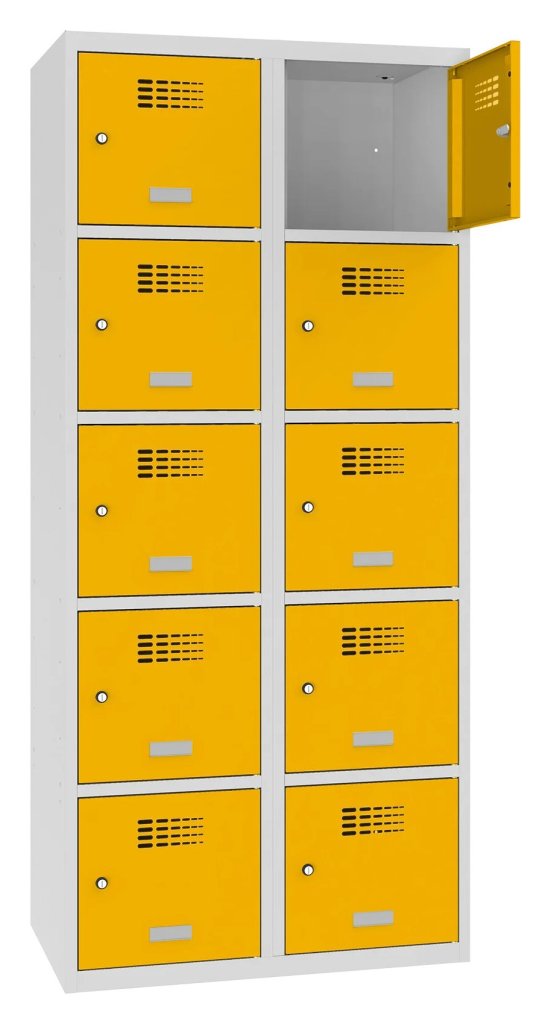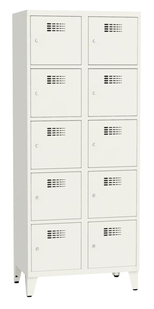 Desetidverová šatníková skrinka so zváranou konštrukciou a moderným dizajnom ventilačného systému. Výška 1800 x šírka 800 x hĺbka 500 mm. Na dverách samolepiaci štítok na meno. 16 farebných odtieňov na výber. Cylindrický zámok alebo uzáver pre visiaci zámok.