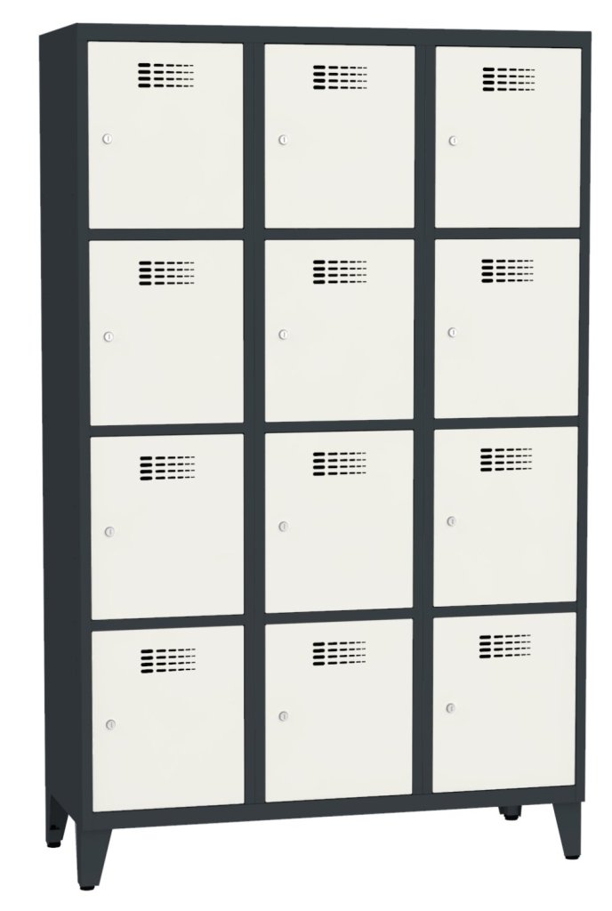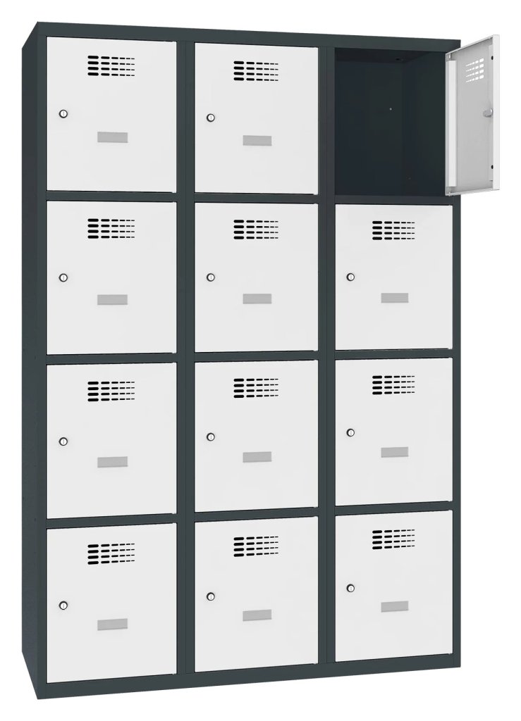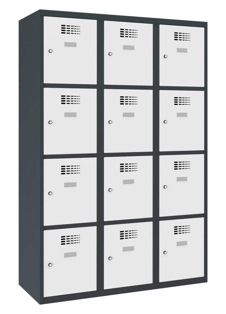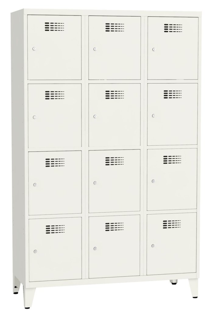 Dvanáctidverová šatníková skrinka so zváranou konštrukciou a moderným dizajnom ventilačného systému. Výška 1800 x šírka 1200 x hĺbka 500 mm. Na dverách samolepiaci štítok na meno. 16 farebných odtieňov na výber. Cylindrický zámok alebo uzáver pre visiaci zámok. Dvere 410x350mm