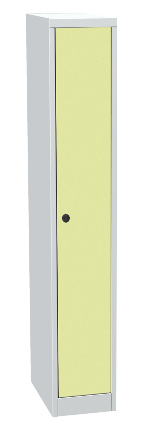 Jednooddielový zváraný šatník výška 1800 x šířka 300 x hloubka 493 mm. Uzamykanie cylindrickým zámkom s dvomi kľúčmi alebo otočným zámkom pre visiaci zámok. Farba korpusu svetlosivá, dvere HPL lamino v dezéne modrá, svetlo zelená alebo svetlo oranžová.