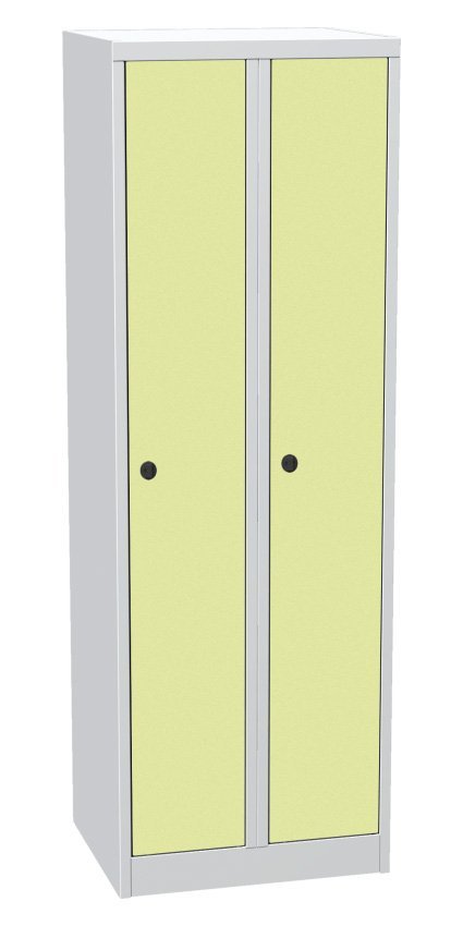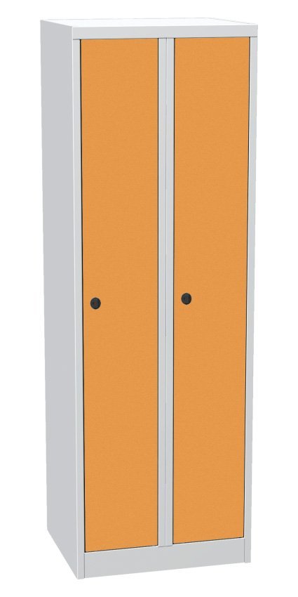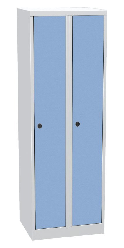 Dvojoddielový zváraný šatník výška 1800 x šířka 600 x hloubka 493 mm. Uzamykanie cylindrickým zámkom s dvomi kľúčmi alebo otočným zámkom pre visiaci zámok. Farba korpusu svetlosivá, dvere HPL lamino v dezéne modrá, svetlo zelená alebo svetlo oranžová. V každom oddielu je ohyb zabraňujúci vtlačeniu dverí dovnútra skrine a vypáčenie zámku.
