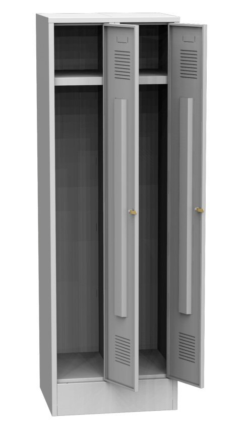 Dvojoddielový zváraný šatník výška 1800 x šířka 600 x hloubka 500 mm. Uzamykanie cylindrickým zámkom s dvomi kľúčmi alebo otočným zámkom pre visiaci zámok. Farba korpusu svetlosivá, dvere lamino buk, breza alebo čerešňa. V každom oddielu je ohyb zabraňujúci vtlačeniu dverí dovnútra skrine a vypáčenie zámku.