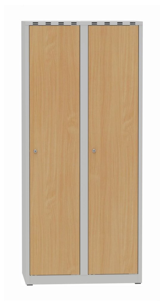 Šatníková skrinka kovová delená s lamino dverami v dezénu buk. Výška 1800 x šírka 600 x hĺbka 500 mm, 4 oddelenia. Zamykanie na kľúč alebo uzáver pre visací zámok. Dodávané na soklu alebo na nohách (v tomto prípade sa výška skrine zvýši o 150 mm). Farba korpusu svetlosivá RAL 7035.