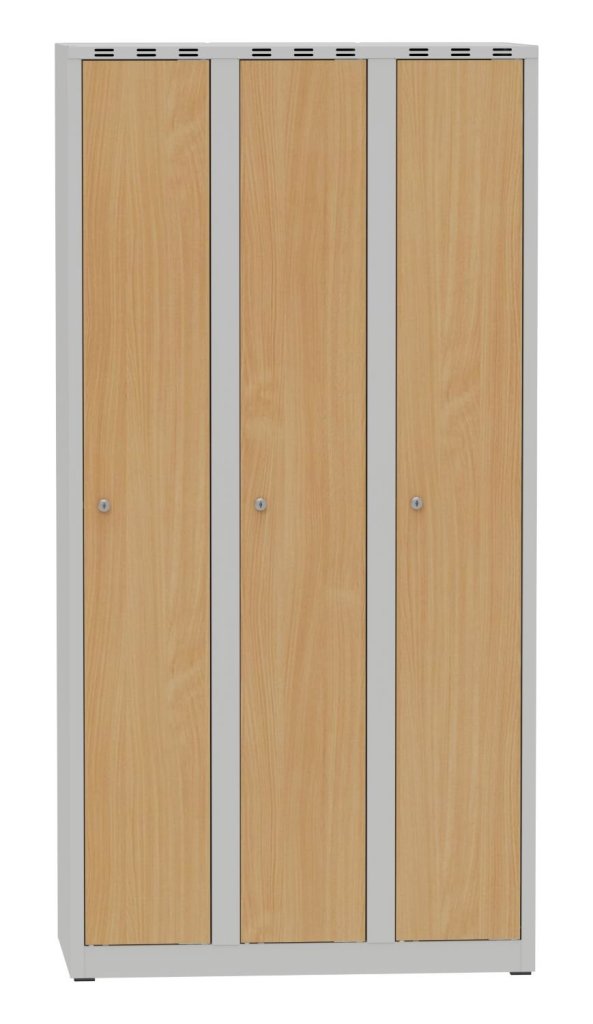 Šatníková skrinka kovová s lamino dverami v dezénu buk. Výška 1800 x šírka 600 x hĺbka 500 mm, 2 oddelenia. Zamykanie na kľúč alebo uzáver pre visací zámok. Dodávané na soklu alebo na nohách (v tomto prípade sa výška skrine zvýši o 150 mm). Farba korpusu svetlosivá RAL 7035.