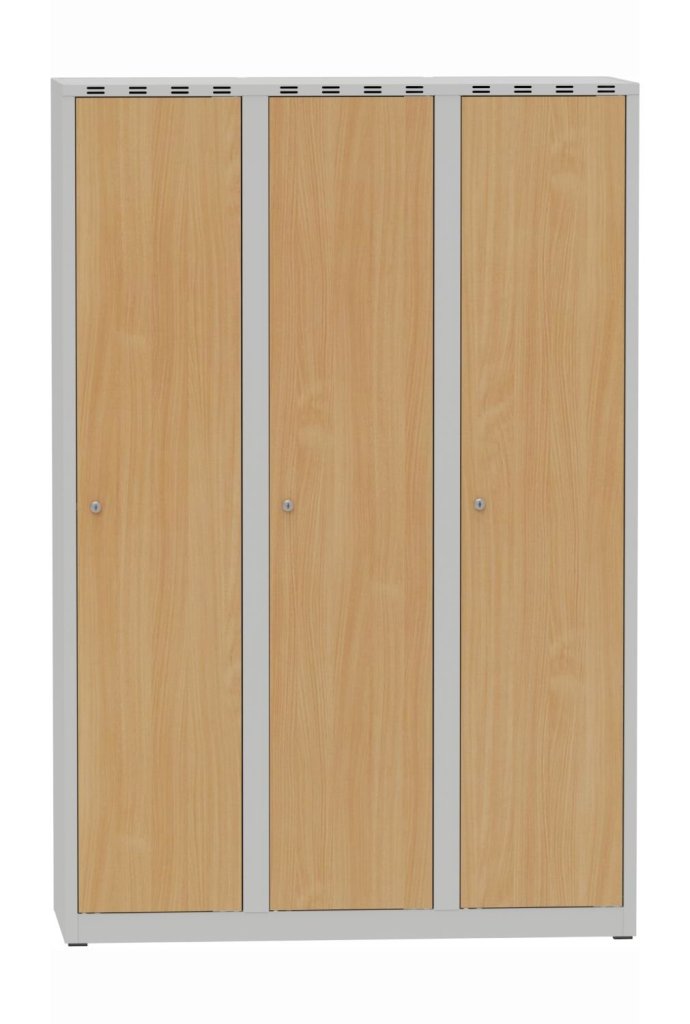 Šatníková skrinka kovová delená s lamino dverami v dezénu buk. Výška 1800 x šírka 600 x hĺbka 500 mm, 4 oddelenia. Zamykanie na kľúč alebo uzáver pre visací zámok. Dodávané na soklu alebo na nohách (v tomto prípade sa výška skrine zvýši o 150 mm). Farba korpusu svetlosivá RAL 7035.