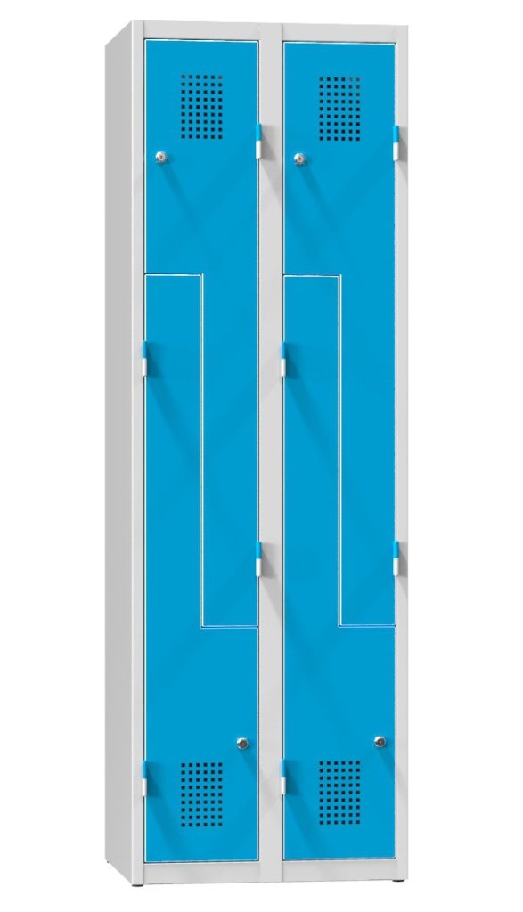 Šatňová skriňa, delené dvere do tvaru Z, výška 1850, šírka 600, hĺbka 500 mm. Zamykanie na cylindrický zámok alebo uzáver. celý popis a parametre