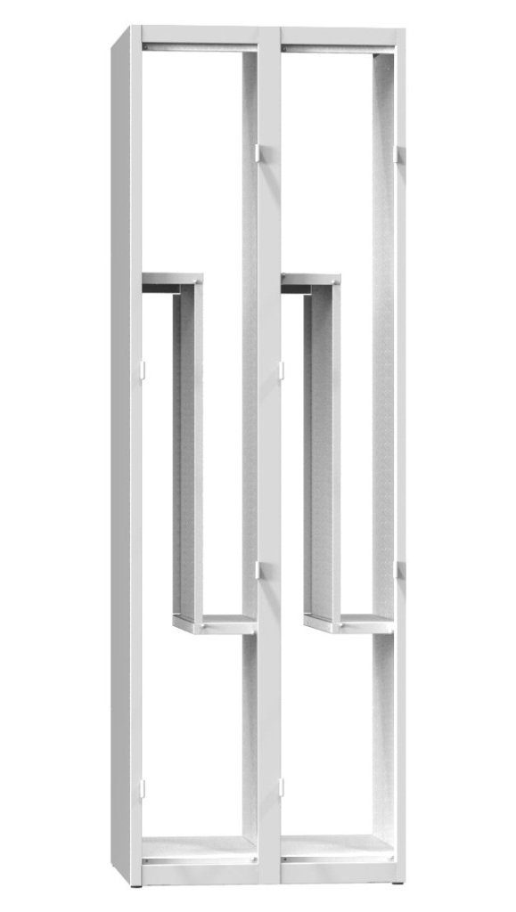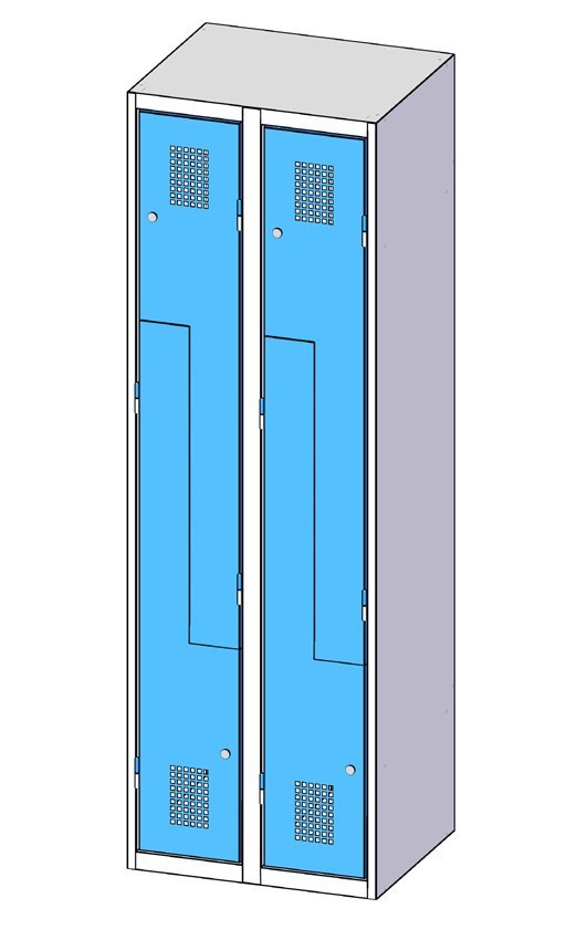 Šatňová skriňa, delené dvere do tvaru Z, výška 1850, šírka 800, hĺbka 500 mm. Zamykanie na cylindrický zámok alebo uzáver. Dorazová plocha proti vpáčeniu, vetracie mriežky, rôzne farebné kombinácie. Priechodzí šírka šatníkovej bunky 350/165 mm.