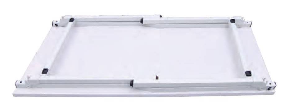 Konferenčný skladací stôl na kovovej podnoži, rozmer dosky 1200 x 600 mm, farba konštrukcie RAL 7035, farba dosky biela. Pracovná plocha je vyrobená z obojstranne laminovanej drevotrieskovej dosky hrúbky 25 mm lemovanej ABS hranou. Výška stolovej dosky v rozloženom stave 720 mm. Výška stola v zloženom stave 95 mm. Bezpečnostné plastové krytky. Rýchle a bezpečné rozloženie a zloženie stola.
