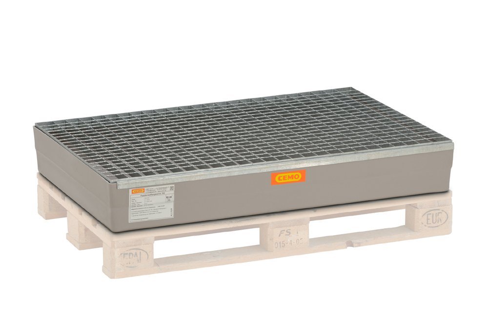 Paletová záchytná vaňa zo sklolaminátu. Rozmer šírka 1200 x hĺbka 800 mm. Bez aretačných zarážok, so schválením. Vhodné pre europalety.