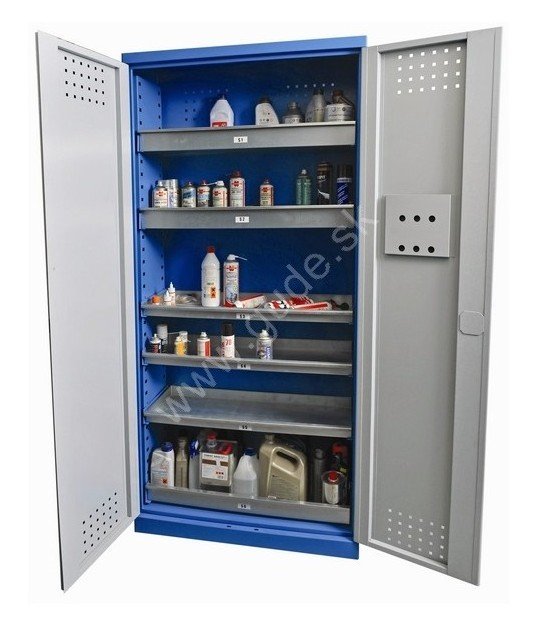 Nebezpečné chemikálie uskladníte v chemickej skrini s moderným dizajnom. Nepriepustné vaničky z pozinkovaného plechu s nosnosťou 40 kg sú prestaviteľné po 28 mm. Vhodné pre skladovanie nebezpečných látok.