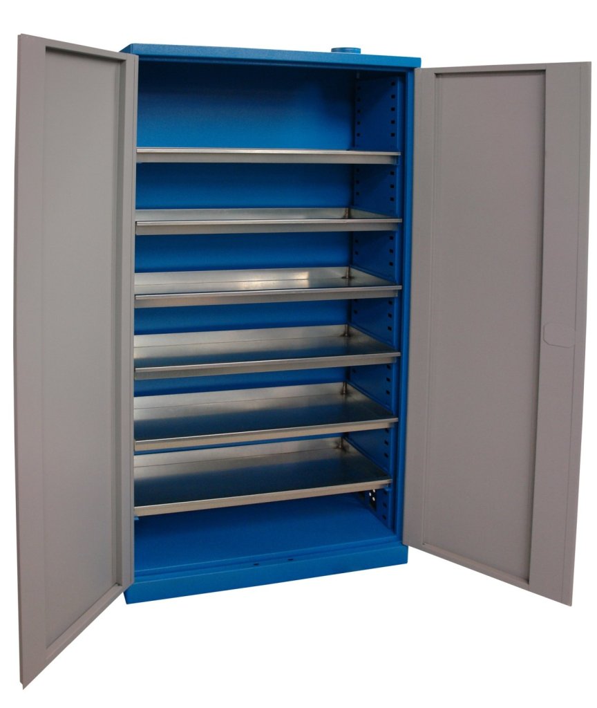 Nebezpečné chemikálie uskladníte v chemickej skrini s moderným dizajnom a komínom. Nepriepustné vaničky z pozinkovaného plechu s celý popis a parametre
