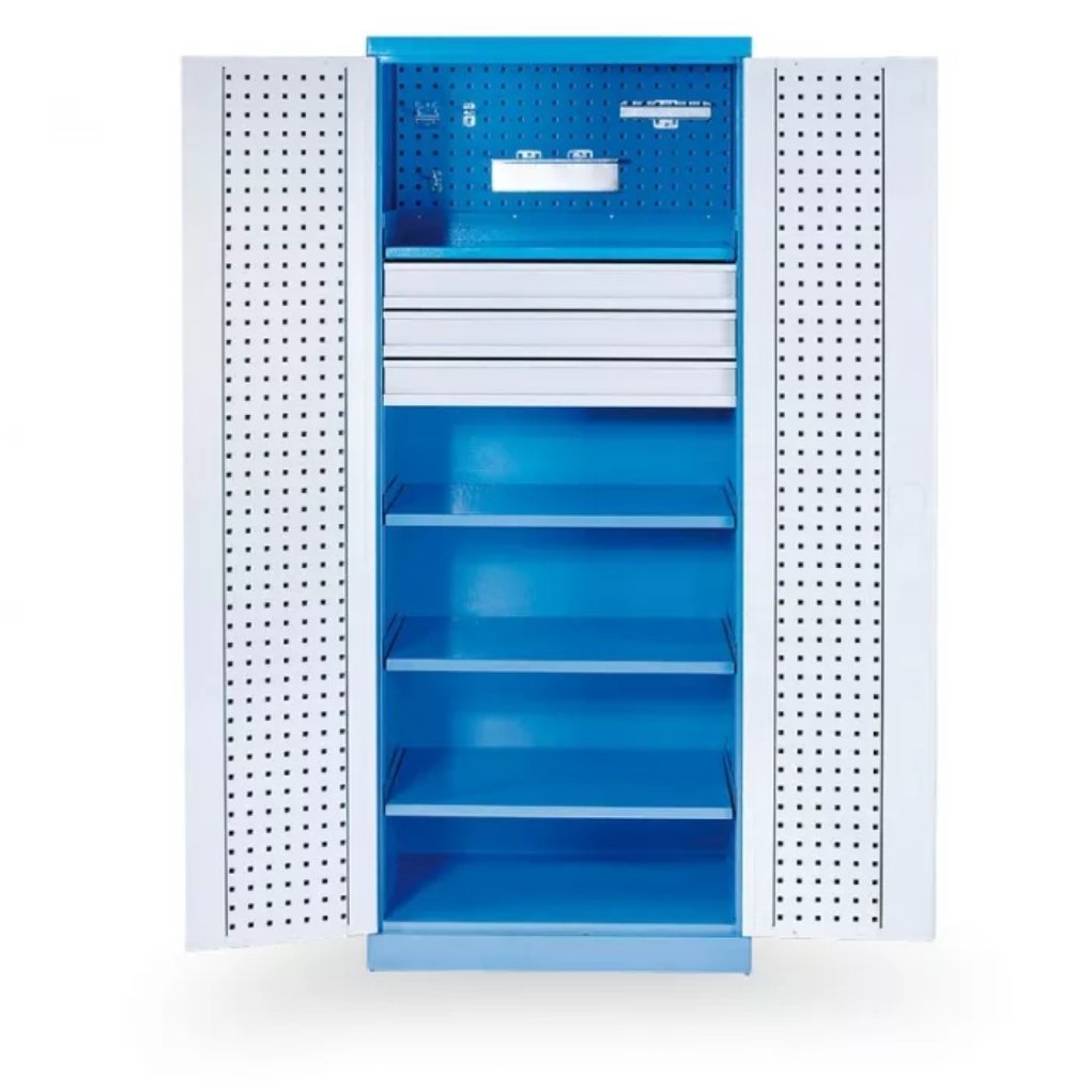 Kvalitná skriňa pre ukladanie náradia vyrobená z oceľového plechu tloušťky 0,7 - 1,5 mm. Vybavená 3 zásuvkami a 4 policami, doplnená o 5-dielnu sadu držiakov náradia. Dvere a chrbát skrine sú vybavené perforáciou spĺňajúce normy EÚ pre zavesenie držiakov náradia. Záruka 2 roky.