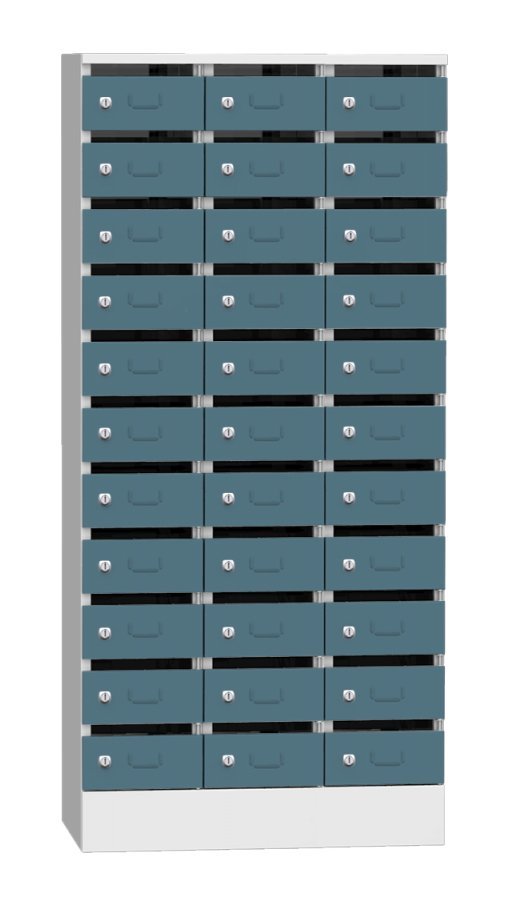 Skriňa je určená na triedenie pošty, dokumentov, či iných cenností. Samostane uzamykateľné schránky na cyl. zámok alebo uzáver pre visiaci zámok. Výška 1950 x šírka 900 x hĺbka 500 mm, 33 oddelení s vhadzovacím otvorom. Farba korpusu svetlosivá RAL 7035.