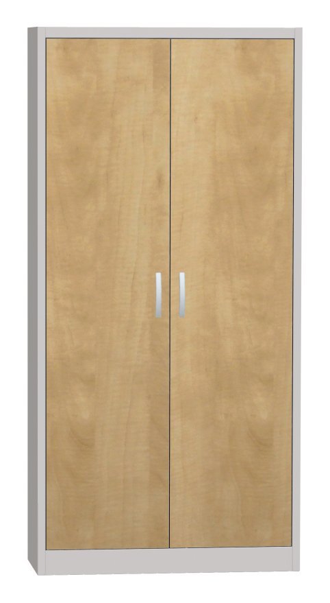 Dvojdverová skriňa s podstavcom, šírka 800, výška 1800, hĺbka 400 mm, 4 police. Možnosť náhrady plných dverí dverami so sklenenou výplňou, s drôtenou výplňou alebo lamino dverami v odtieni buk, breza alebo čerešňa. Farba korpusu RAL 7035 svetlosivá.