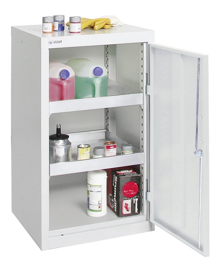 Skriňa pre ukladanie chemických látok s vaničkami na zachytenie unikajúcich kvapalín. 2x pozinkovaná prestaviteľná polica (vanička) s nosnosťou 100 kg. Dvojbodový cylindrický zámok. Farba korpusu svetlosivá RAL 7035, farba dverí svetlosivá RAL 7035, modrá RAL 5010 alebo žltá RAL 1003. Výška 900 x šírka 1000 x hĺbka 500 mm.