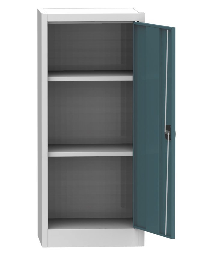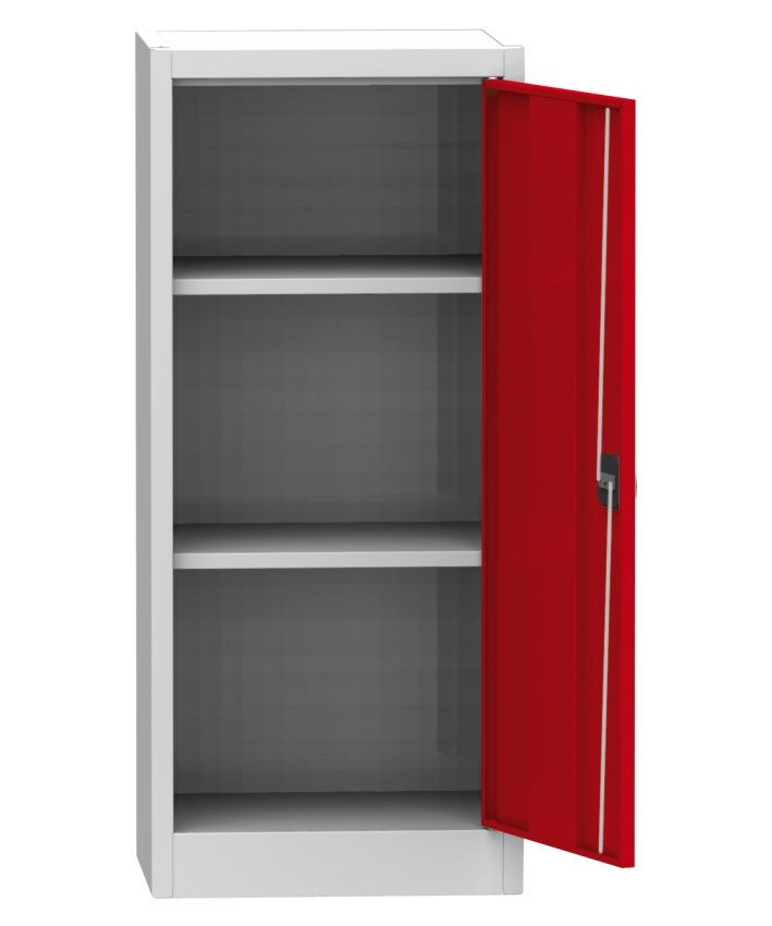 Skriňa s plnými dverami, výška 800 x šírka 505 x hĺbka 400 mm. Zamykanie na cylindrický zámok s rozvorovým mechanizmom. 1 x staviteľná oceľová polica (nosnosť 60 kg). Možnosť náhrady plných dverí dverami so sklenenou výplňou, s drôtenou výplňou alebo lamino dverami v odtieni buk, breza alebo čerešňa. Farba korpusu RAL 7035 svetlosivá.