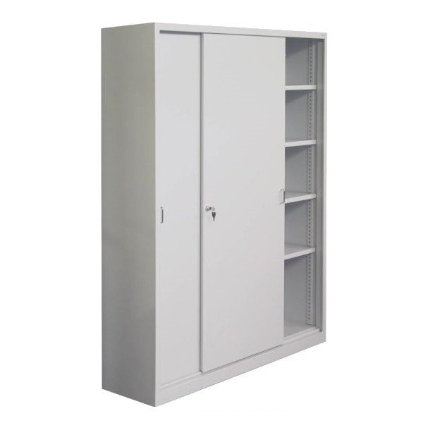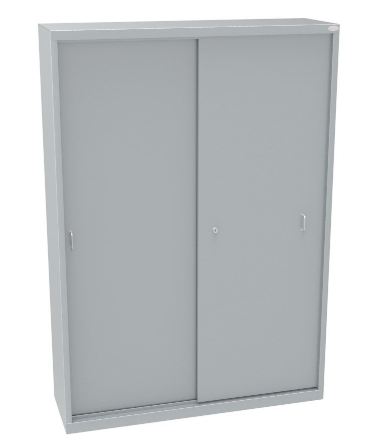 Kovová skriňa s posuvnými dverami a s 4 policami. Rôzne farby na výber. Výška 1990 x šírka 1200 x hĺbka 435 mm.