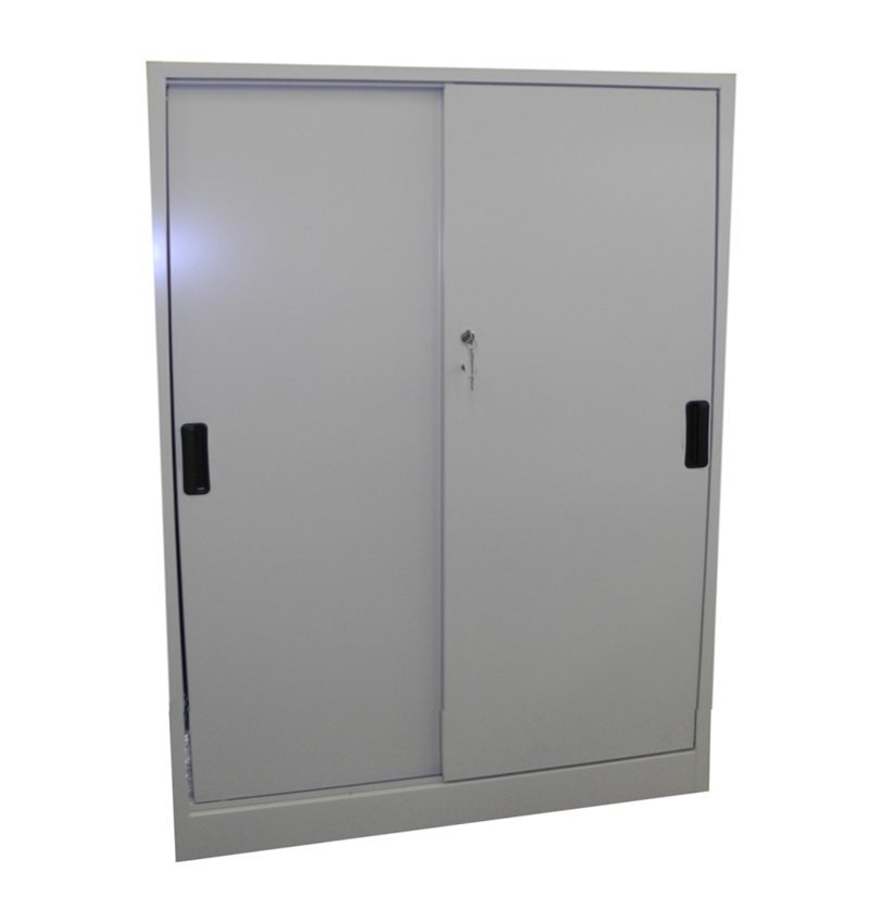 Kovová skriňa s posuvnými dverami, výška 1150 x šírka 950 x hĺbka 400 mm, 2x nastaviteľná polica. Posuvné dvere so zámkom v niekoľkých farebných odtieňoch, korpus svetlosivý RAL 7035.