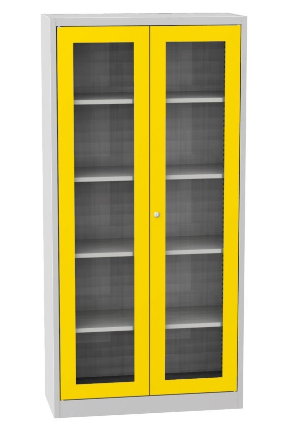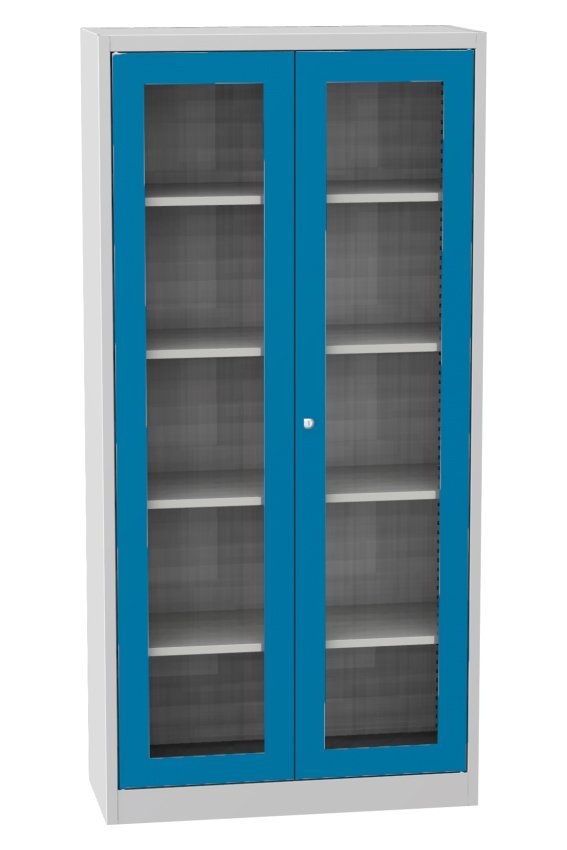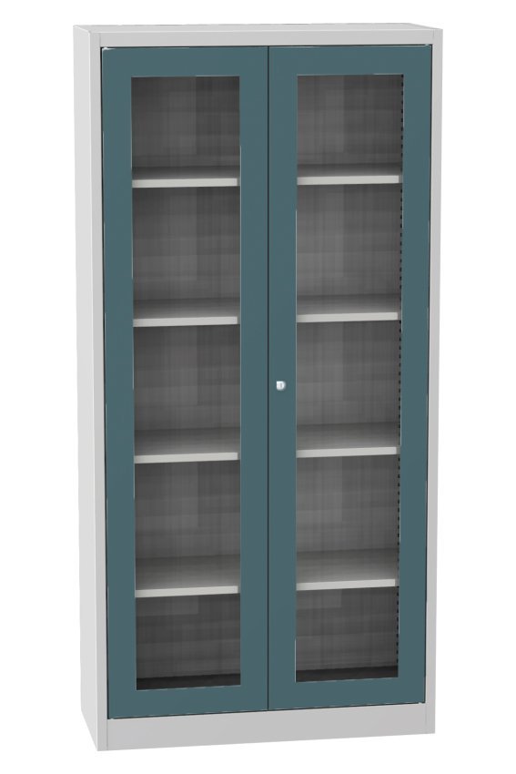 Dvojdverová skriňa s podstavcom a sklenenou výplňou dverí, šírka 950, výška 1950, hĺbka 400 mm, 4 police. Možnosť náhrady dverí so sklenenou výplňou dverami s drôtenou výplňou alebo lamino dverami v odtieni buk, breza alebo čerešňa. Farba korpusu RAL 7035 svetlosivá.