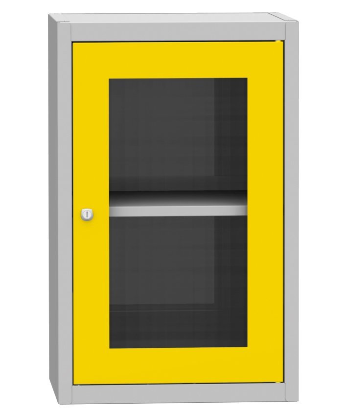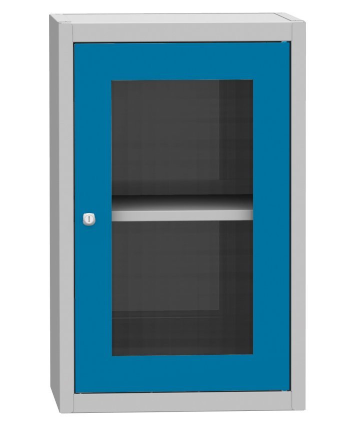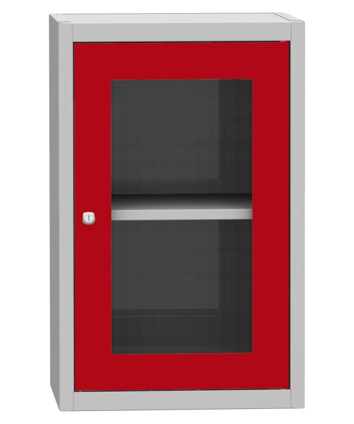 Skriňa so sklenenými dverami, výška 800 x šírka 505 x hĺbka 400 mm. Zamykanie na cylindrický zámok s rozvorovým mechanizmom. 1 x staviteľná oceľová polica (nosnosť 60 kg). Sklenené dvere sú z tvrdeného skla. Farba korpusu RAL 7035 svetlosivá.