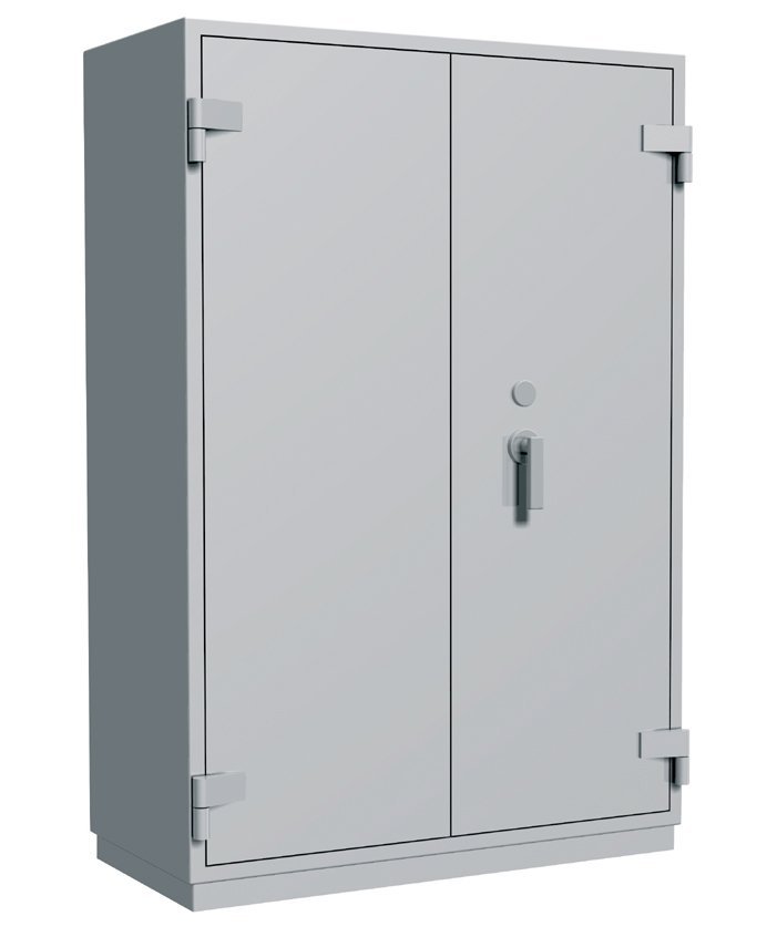 Skriňa so zvýšenou odolnosťou proti ohňu dvojdverová, 3 prestaviteľné police, zamykanie na trezorový kľúč. Výška 1560 x šírka 950 x hĺbka 550 mm, hmotnosť 350 kg, farba svetlosivá RAL 7035. Doprava hradená podľa miesta dodania.