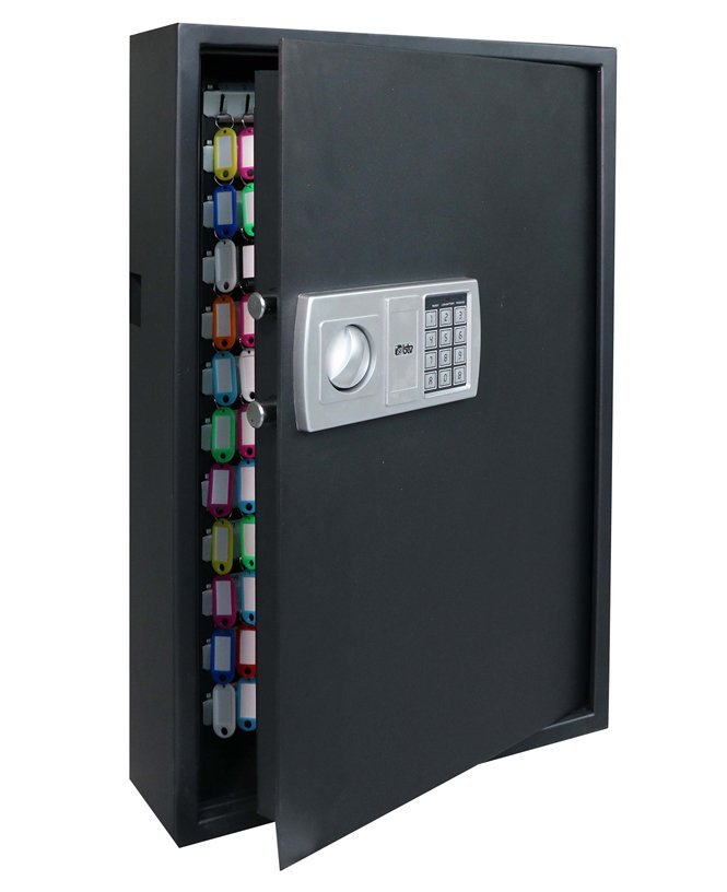 Jednoplášťová skrinka na 144 kľúčov, výška 660 x šírka 430 x hĺbka 100 mm. Zamykanie na elektronický kód, núdzový kľúč, farba čierna. Bočný otvor pre uloženie kľúčov pri zatvorených dverách.