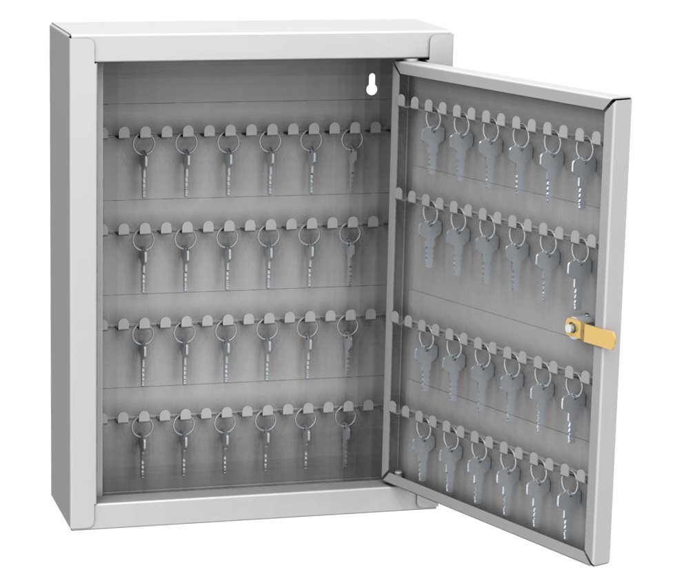 Skrinka na kľúče kovová, výška 450 x šírka 350 x hĺbka 110 mm, farba svetlosivá RAL 7035. Zamykanie na kľúč alebo na uzáver pre celý popis a parametre