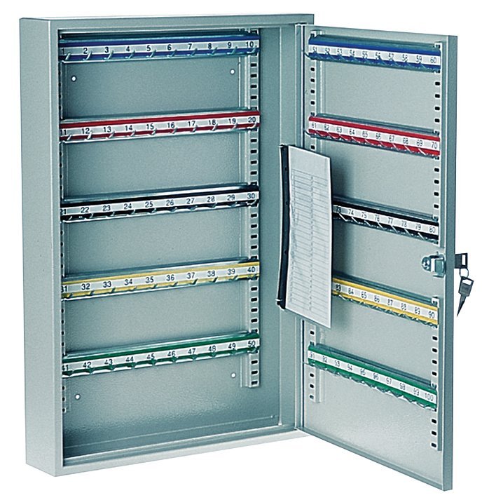 Skrinka na kľúče typ S 100 na 100 kľúčov. Obsahuje háčiky s visačkami, zamykanie na kľúč. Výška 550 mm, šírka 380 mm, hĺbka 80 mm. Nastaviteľné lišty s háčikmi podľa dĺžky kľúčov.