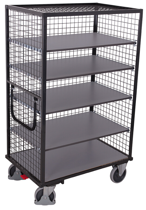 Skriňový vozík nemeckej výroby s madlom, steny z drôtené mriežky, konštrukcia zo zvárané uhlovej ocele. Dvojkrídlové otváracie dvere. Police z tvrdého materiálu na báze dreva. Nosnosť jednej police je 90 kg. 4 špeciálne pneumatické kolieska Fetra TPE, z toho 2 otočné s brzdou, 2 pevné.