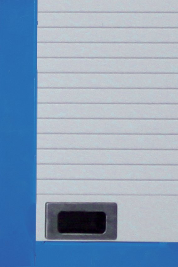 Vozík z oceľovej konštrukcie, s trubkovitým madlom, plne zváraný, s dverami a rukoväťou. Základňa a police z materiálu na báze dreva, povrchová úprava buk. 1 pevná polica, 4 prestaviteľné. Konštrukcia a dvere RAL 5010 modrá. Vysoko odolná termoplastická kolieska, centrálný brzdový systém. Výška 1800 mm, šírka 1115 mm, hĺbka 730 mm.