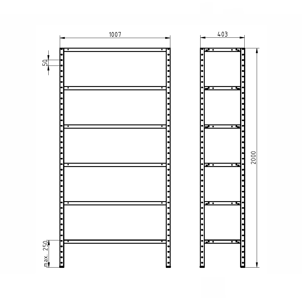 Kovové skrutkové regály určené k širokému použitiu v skladoch, archívoch, garážach, kanceláriách a iných úložných priestoroch. Výška 2000 mm, šírka 1000 mm, hĺbka 400 - 600 mm, 6 políc. Nosnosť police je stanovená na maximálne rovnomerné zaťaženie 250 kg a slúži na ukladanie ťažkých predmetov. Jednoduchá montáž pomocou skrutkových spojov.