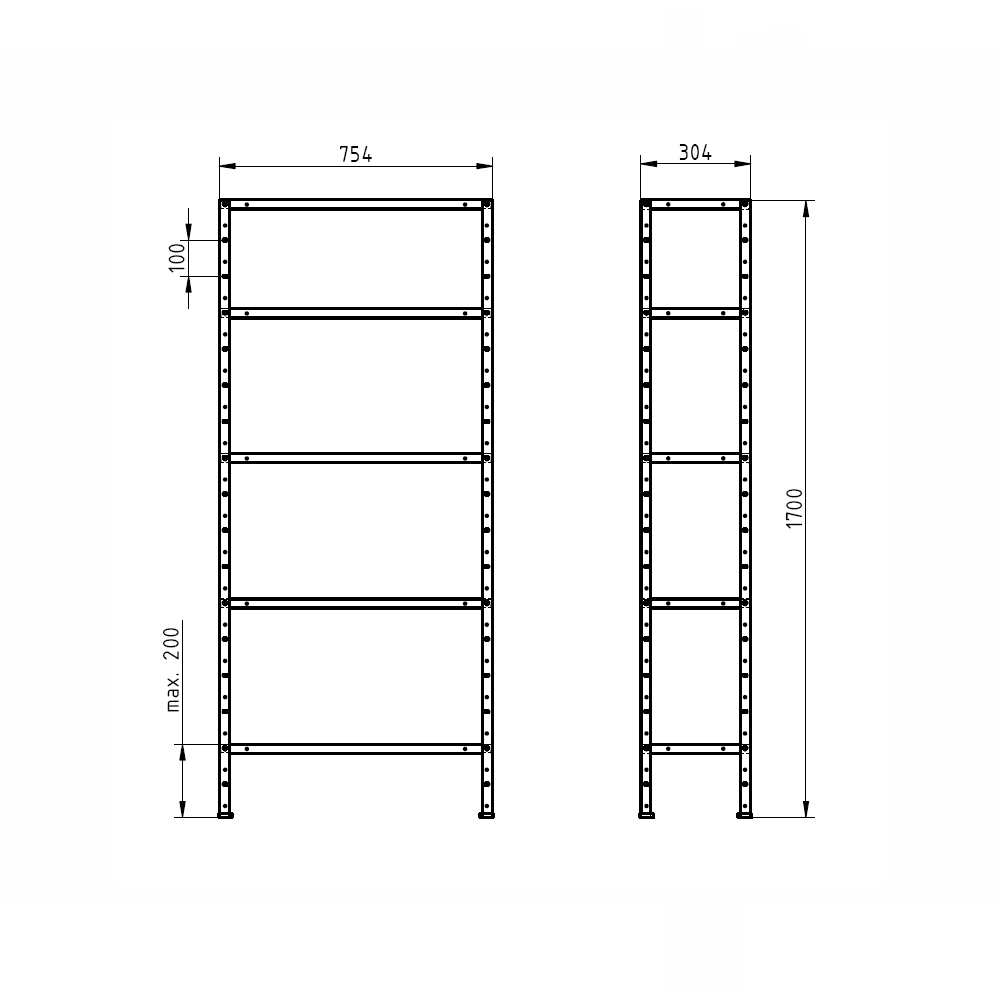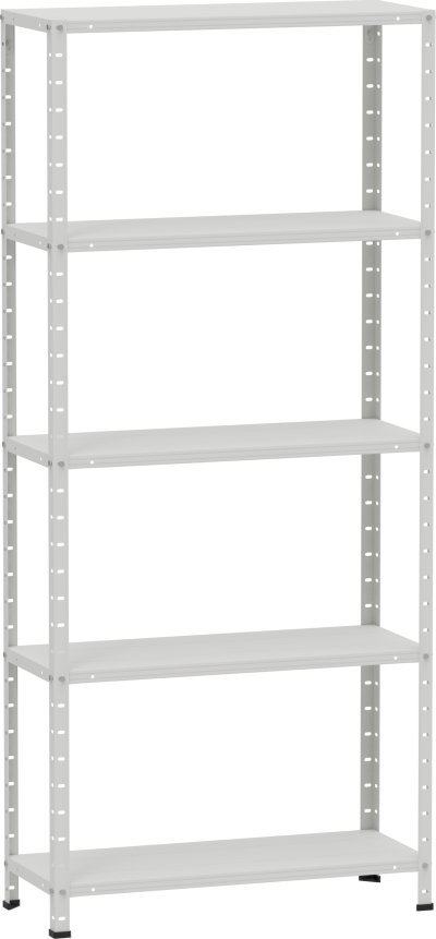 Ľahké kovové skrutkové regály určené k širokému použitiu, výška 1400 - 1800, šírka 700 - 750, hĺbka 300 mm. Nosnosť police je stanovená na maximálne rovnomerné zaťaženie 50 kg a slúži k ukladaniu ľahších predmetov. Police sú voľne prestaviteľné po 50 mm. Jednoduchá montáž pomocou skrutkových spojov.