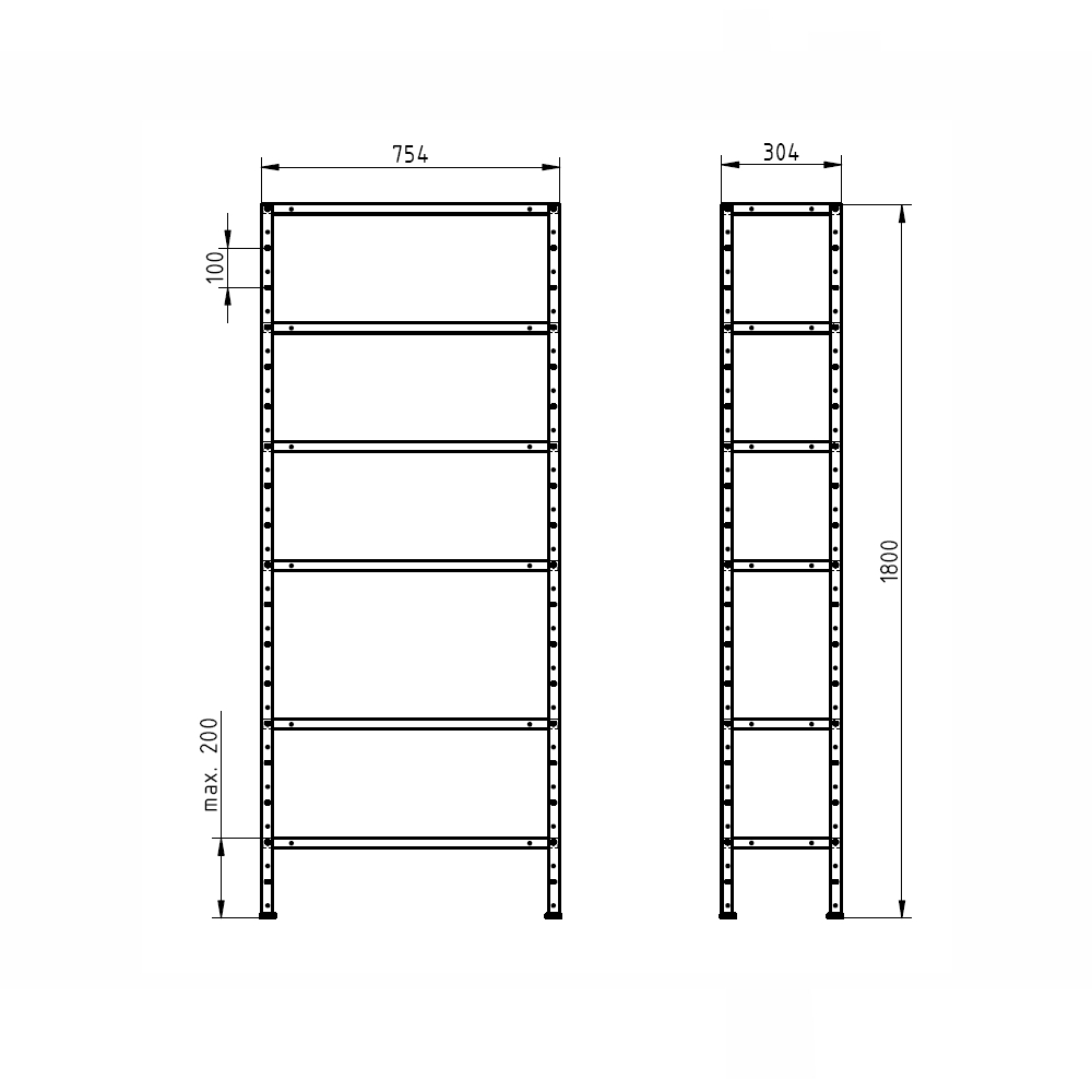 Ľahký kovový skrutkový regál určený k širokému použitiu, výška 1800, šírka 750, hĺbka 300 mm. Nosnosť police je stanovená na maximálne rovnomerné zaťaženie 50 kg a slúži k ukladaniu ľahších predmetov. Police sú voľne prestaviteľné po 50 mm. Jednoduchá montáž pomocou skrutkových spojov.