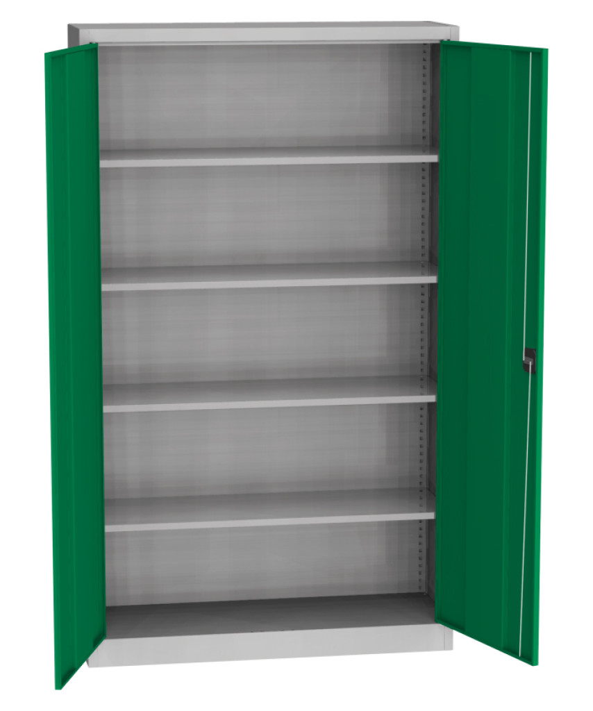 Dvojdverová skriňa s podstavcom, šírka 1200, výška 1950, hĺbka 800 mm, 4 police. Farba korpusu RAL 7035 svetlosivá.