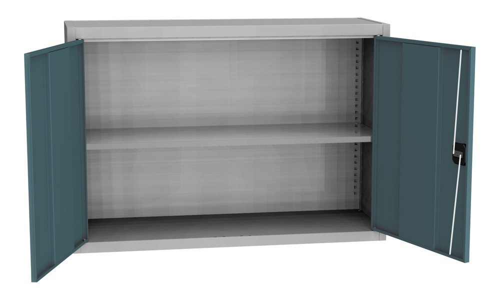 Dvojdverová kovová skriňa s podstavcom, šírka 950, výška 1150, hĺbka 400 mm, dve police. Možnosť náhrady plných dverí dverami so sklenenou výplňou, s drôtenou výplňou alebo lamino dverami v odtieni buk, breza alebo čerešňa. Farba korpusu RAL 7035 svetlosivá.