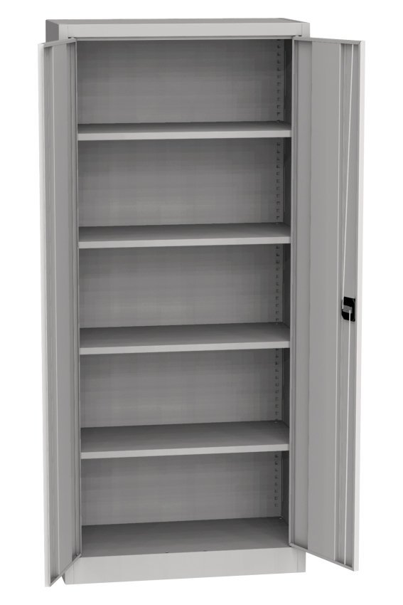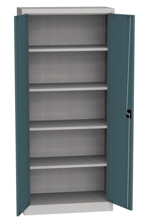 Dvojdverová kovová skriňa so štyrmi policami, šírka 950, výška 1950, hĺbka 400 mm. Možnosť náhrady plných dverí dverami so sklenenou výplňou, s drôtenou výplňou alebo lamino dverami v odtieni buk, breza alebo čerešňa. Farba korpusu RAL 7035 svetlosivá. K rýchlemu dodaniu iba v prevedeniu s oceľovými dverami ( svetlosivá, svetlosivá/modrá), ostatné varianty na objednávku.