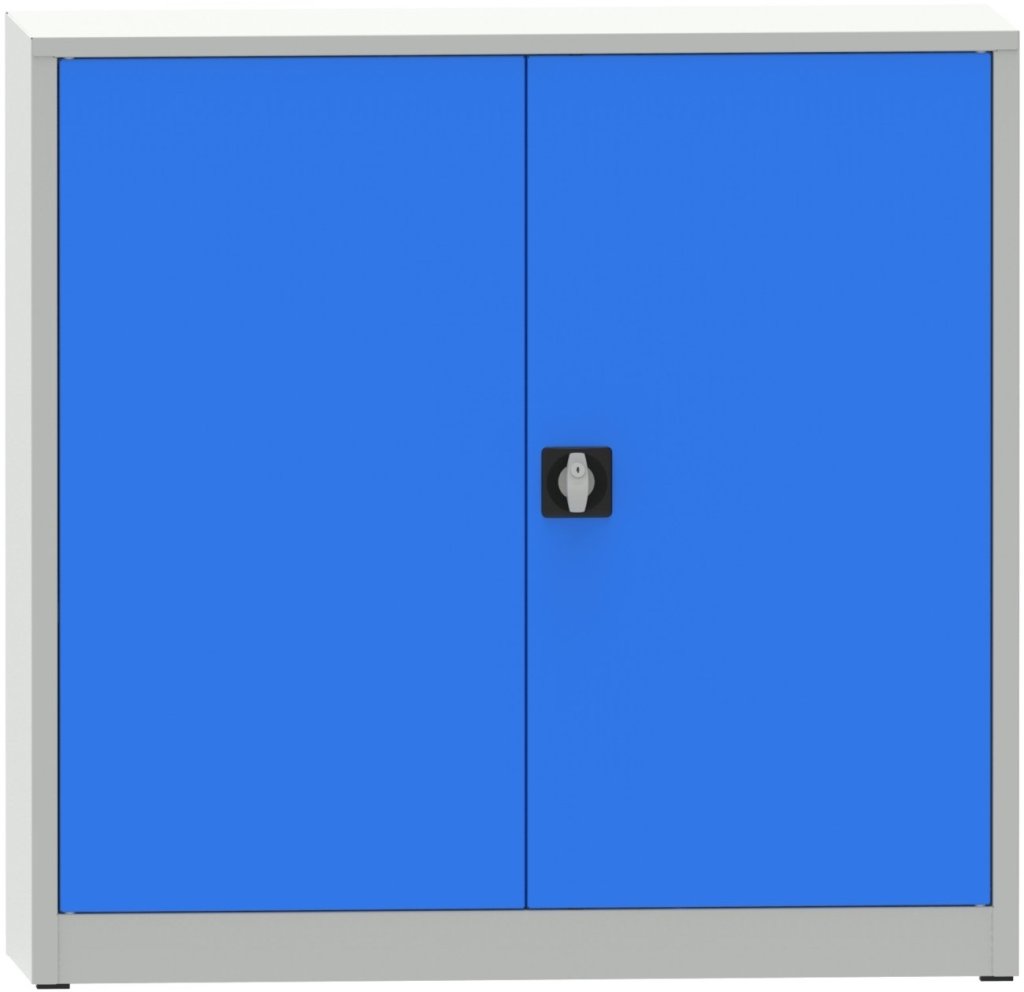Dvojdverová kovová zvarovaná skriňa, šírka 1200, výška 1150, hĺbka 400 mm, 2x prestaviteľná polica. Farba korpusu RAL 7035 sivá, dverí RAL 7035 sivá a RAL 5012 modrá.