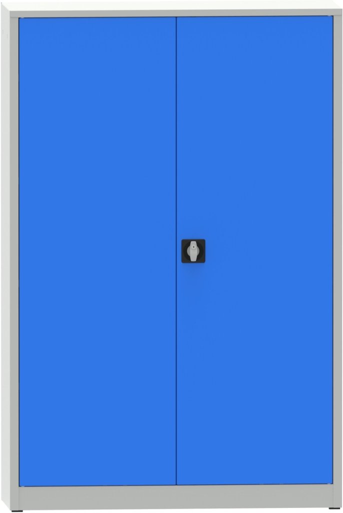 Dvojdverová kovová zvarovaná skriňa, šírka 1200, výška 1800, hĺbka 500 mm, 4x prestaviteľná polica. Farba korpusu RAL 7035 sivá, dverí RAL 7035 sivá a RAL 5012 modrá.