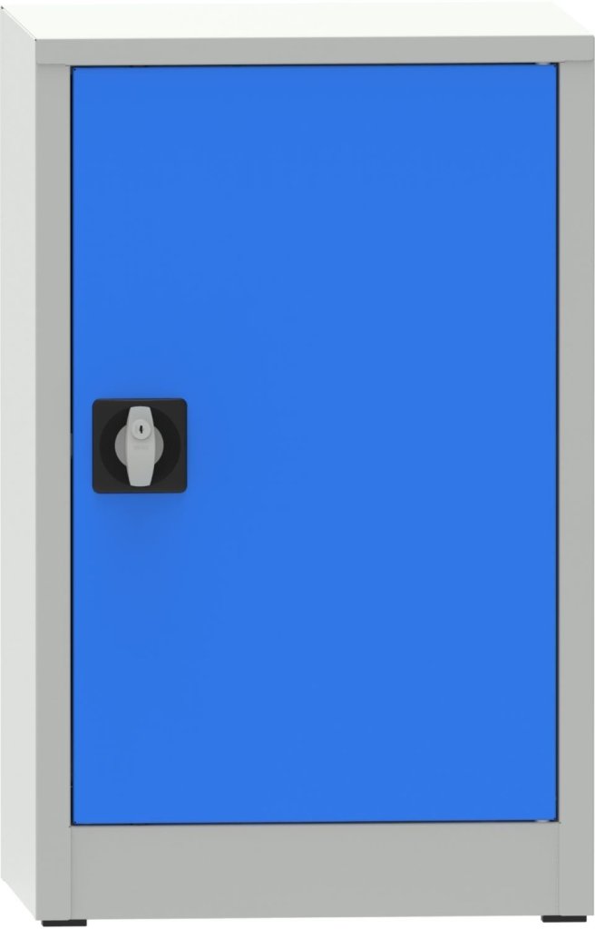 Kovová zvarovaná skriňa, šírka 508, výška 800, hĺbka 600 mm, 1x prestaviteľná polica. Farba korpusu RAL 7035 sivá, dverí RAL 7035 sivá a RAL 5012 modrá.