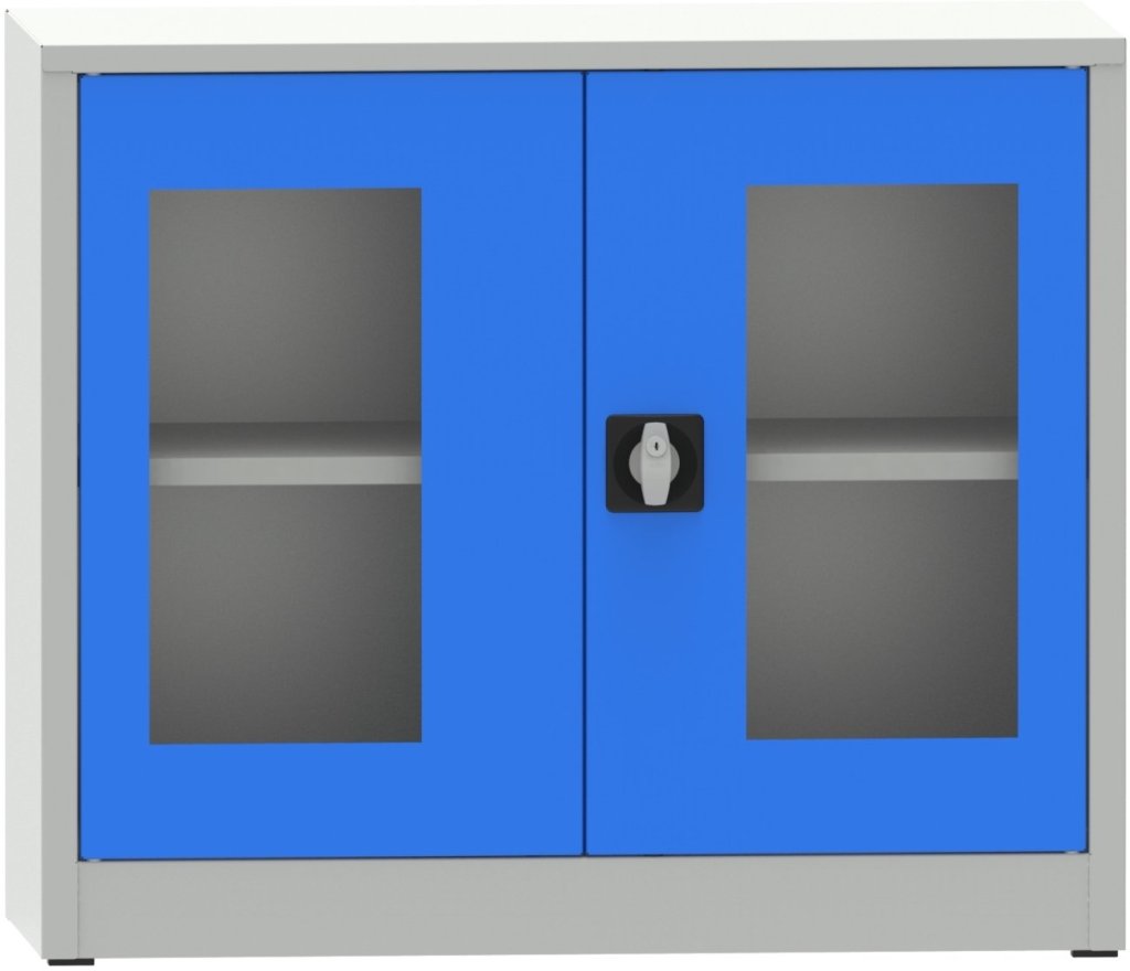 Dvojdverová kovová zvarovaná skriňa s presklenými dverami plexisklom, šírka 950, výška 800, hĺbka 600 mm, 1x prestaviteľná polica. Farba korpusu RAL 7035 sivá, dverí RAL 7035 sivá a RAL 5012 modrá.