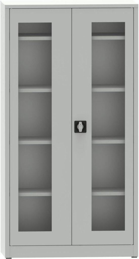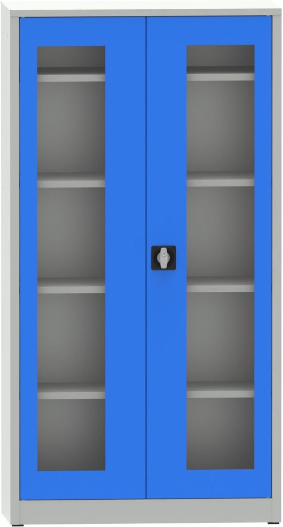 Dvojdverová kovová zvarovaná skriňa s presklenými dverami plexisklom, šírka 950, výška 1800, hĺbka 400 mm, 4x prestaviteľná polica. Farba korpusu RAL 7035 sivá, dverí RAL 7035 sivá a RAL 5012 modrá.