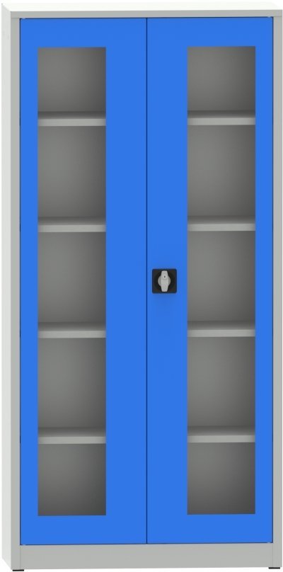 Dvojdverová kovová zvarovaná skriňa s presklenými dverami plexisklom, šírka 950, výška 1950, hĺbka 500 mm, 4x prestaviteľná polica. Farba korpusu RAL 7035 sivá, dverí RAL 7035 sivá a RAL 5012 modrá.