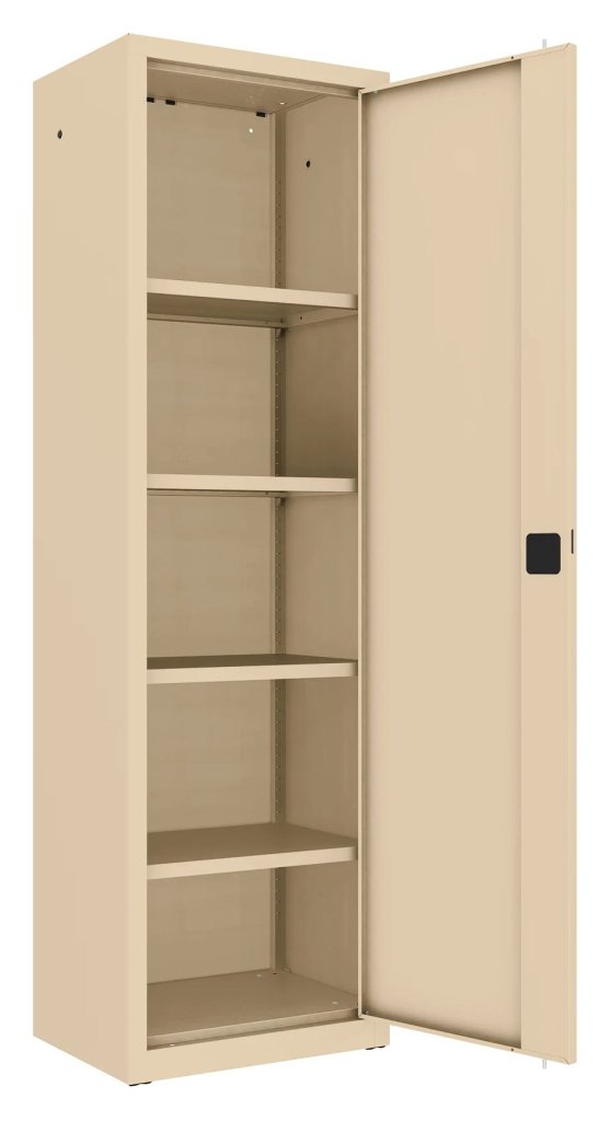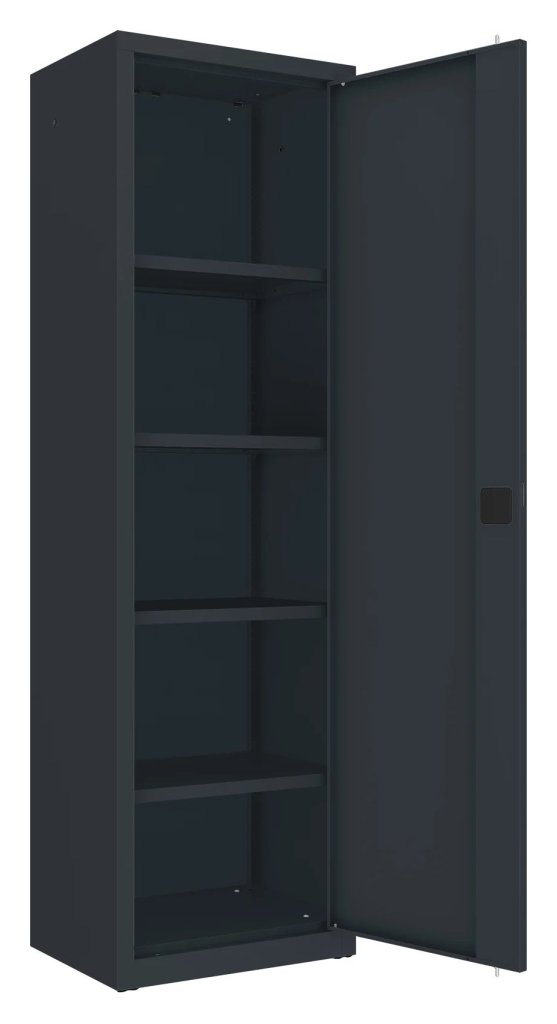 Jednodverová kovová skriňa so štyrmi policami, šírka 600 mm, výška 1990, hĺbka 435 mm. Dvojbodový rozvorový zámok, rôzne farby.