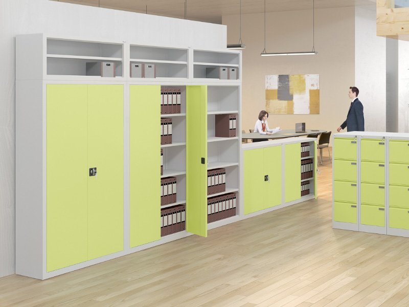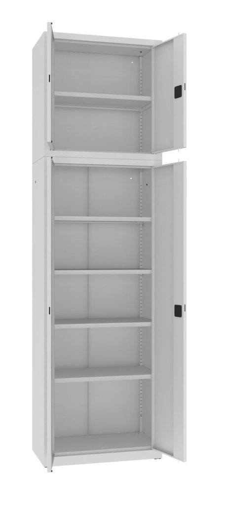 Dvojdverová kovová skriňa so štyrmi policami, šírky 800 mm, výška 1990, hĺbka 435 mm doplnená o nadstavec s jednou policou, šírka 800 mm, výška 810, hĺbka 435 mm. Dvojbodový rázvorový zámok, rôzne farby.