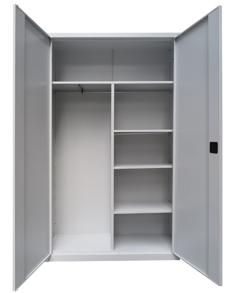 Dvojdverová kovová skriňa na šanóny, 4 police, šírka 914, výška 1950, hĺbka 400 mm, rôzne farby, uzamykateľná. Skladom vo farbe svetlosivá (RAL 7035) za akčnú cenu.