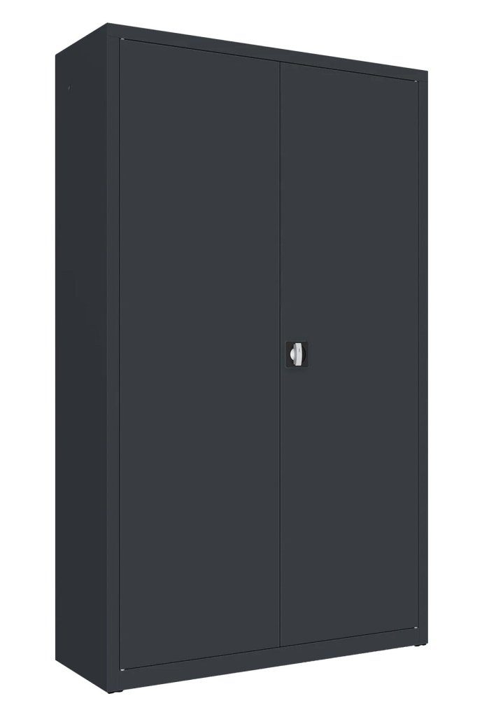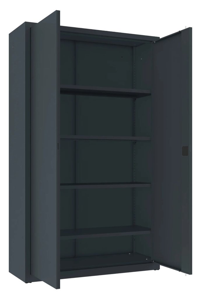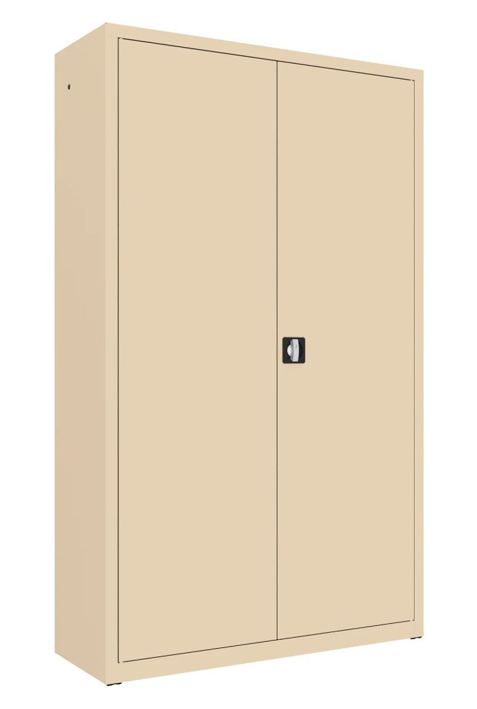Dvojdverová kovová skriňa so štyrmi policami, šírky 1200 mm (pozri varianty produktu), výška 1990, hĺbka 435 mm. Dvojbodový rozvorový zámok, rôzne farby.