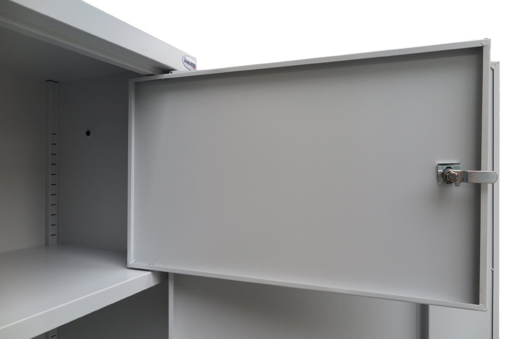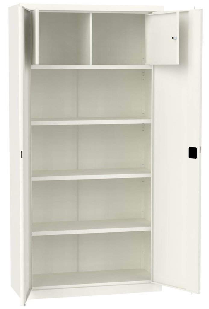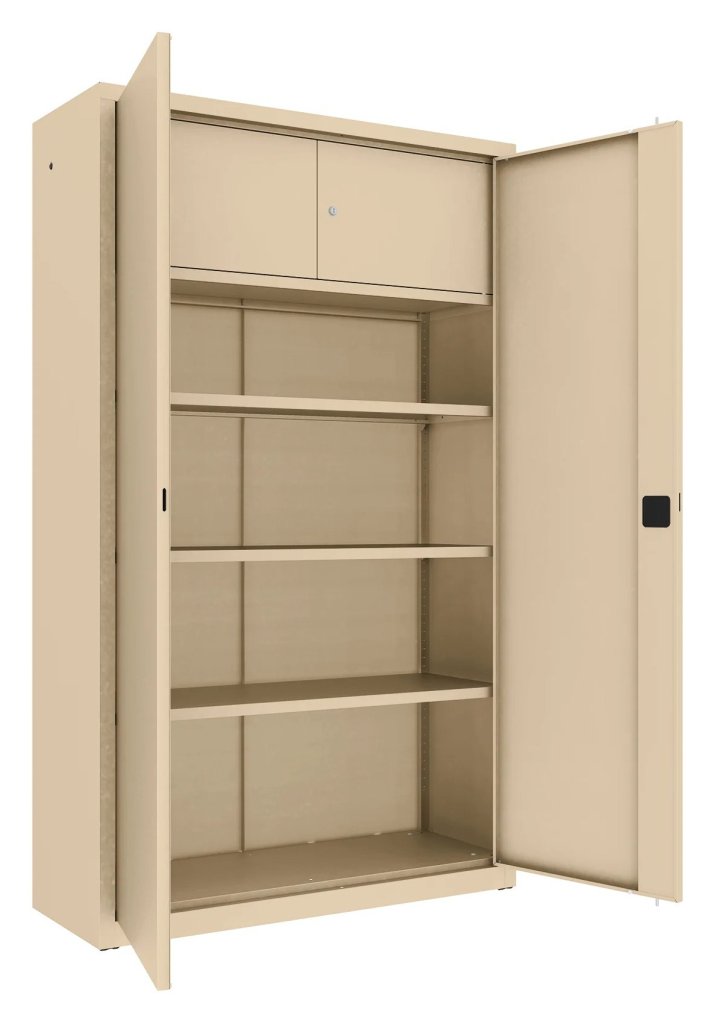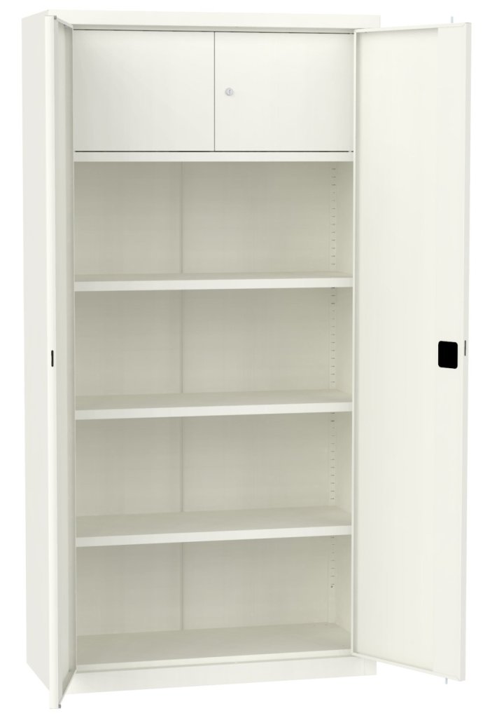 Dvojdverová kovová skriňa s jednou policou, vhodná ako nadstavec. Šírka 600 / 800 / 1000 / 1200 mm (pozri varianty produktu), výška 465, hĺbka 435 mm. Dvojbodový rozvorový zámok, rôzne farby.
